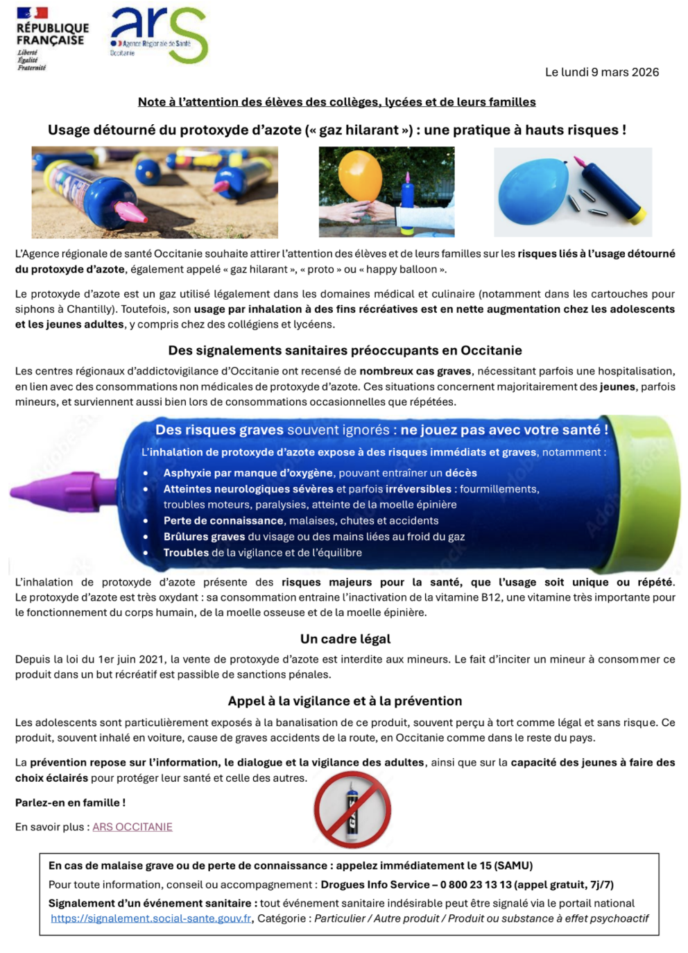 L’Agence Régionale de Santé Occitanie (ARS) nous alerte sur l'usage détourné du protoxyde d'azote chez les adolescents et jeunes adultes.