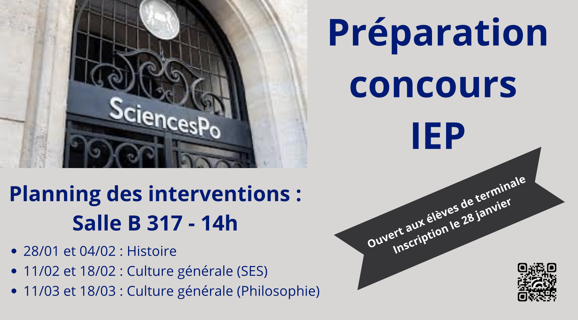 Des séances d'initiation à la préparation des IEP sont organisées à l'attention des élèves volontaires les mercredis de 14 à 16h.