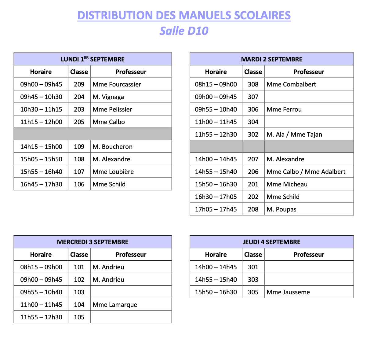 Avec le soutien des fédérations de parents d'élèves, la distribution des manuels scolaires se fera selon le planning suivant :