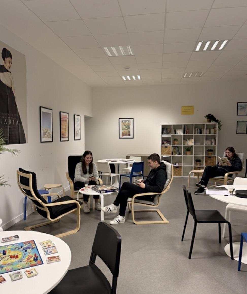 De nouveaux éléments de décoration ont récemment été ajoutés afin de créer une atmosphère plus chaleureuse. Plantes vertes, affiches murales et livres viennent désormais habiller le foyer et lui donner un esprit à la fois moderne et apaisant. Ces touches décoratives transforment l’espace en un véritable lieu de détente où chacun peut se retrouver, échanger ou simplement se relaxer entre deux cours.