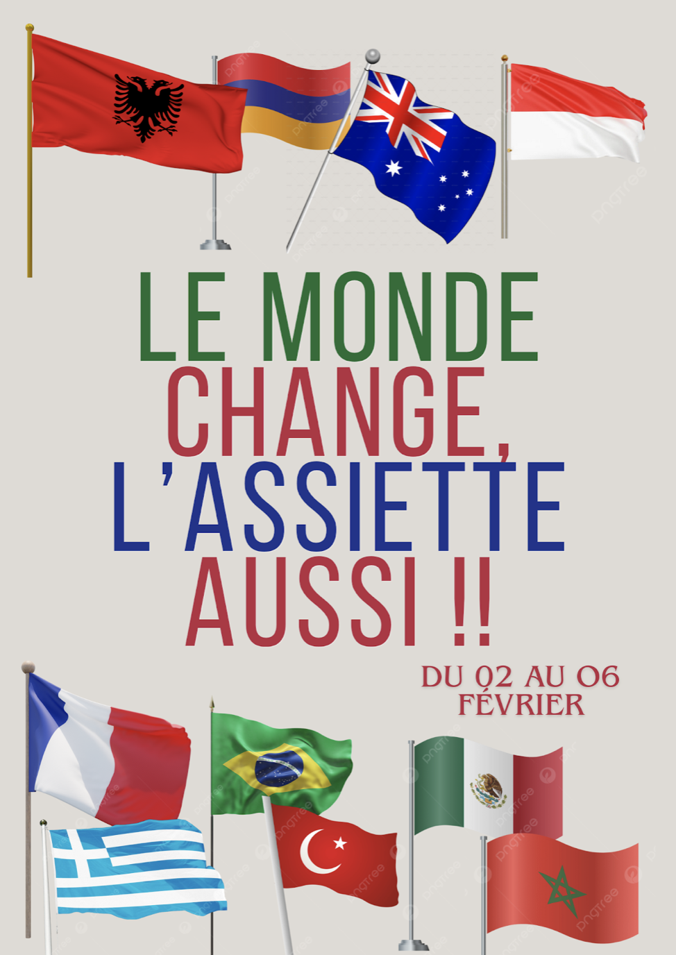 Tout au long de cette première semaine de février, le service de restauration du lycée s’associera à cette initiative. Pilotée par notre cheffe de cuisine, Sandrine Ramade, la cantine proposera des menus inspirés du continent mis à l’honneur chaque jour.