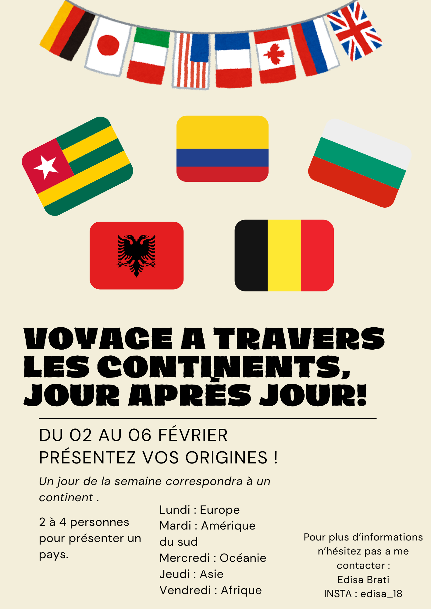Cette initiative a pour objectif de mettre en valeur la diversité culturelle présente au sein de notre lycée en invitant les élèves à présenter leurs origines, leurs cultures et leurs traditions. Chaque jour de la semaine sera dédié à un continent, présenté par 2 à 4 élèves volontaires.