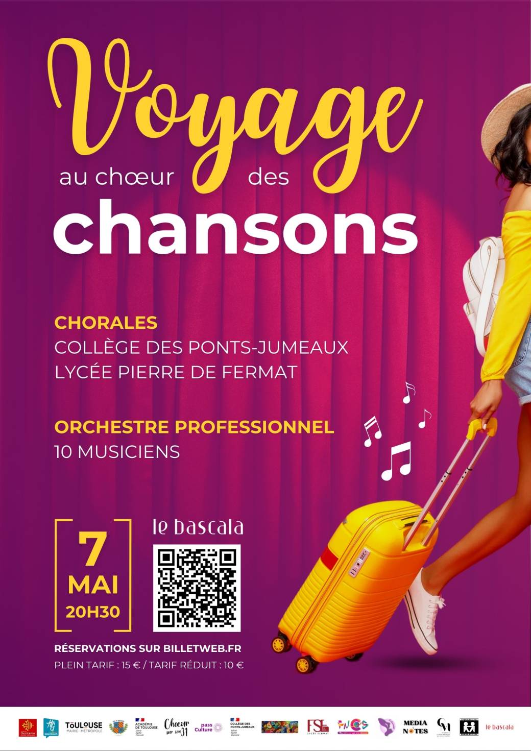 De Paris à New York, de Rome à Mexico, de Tunis jusqu'à l’Afrique du Sud, embarquez pour un tour du monde musical haut en couleurs. Redécouvrez les classiques intemporels d’Édith Piaf, Jacques Brel, Patrick Bruel, Miriam Makeba, Céline Dion, The Mamas and the Papas ou encore Michael Jackson, revisités dans un format inédit … Sur scène, 200 élèves et professeurs des chorales du collège des Ponts-Jumeaux et du lycée Pierre de Fermat de Toulouse, accompagnés par un orchestre de 10 musiciens professionnels, vous feront vivre un spectacle festif et plein de vie. Un concert événement à ne pas manquer : embarquement immédiat pour un voyage riche en émotions !